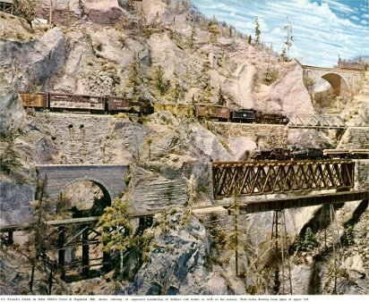 From the 1964 edition centerfold; the caption: French's Gulch on John Allen's Gorre & Daphetid RR. shows coloring to represent weathering of bridges and trains…