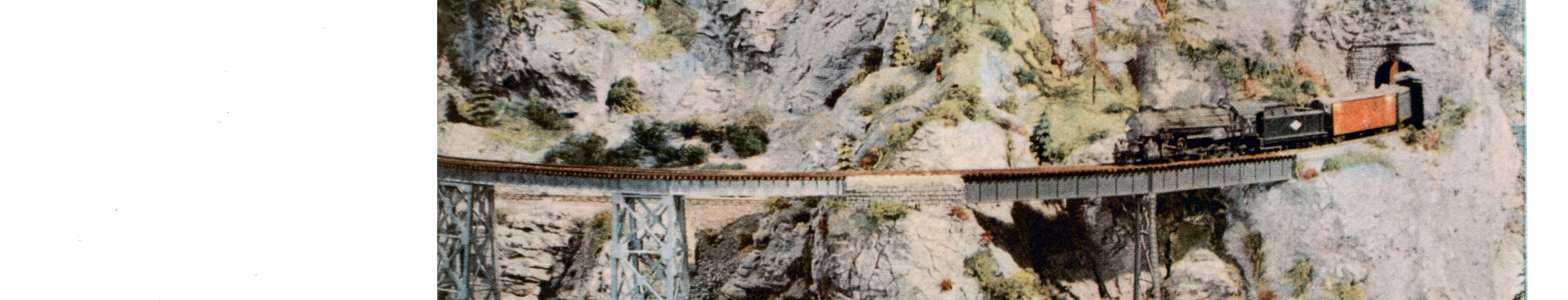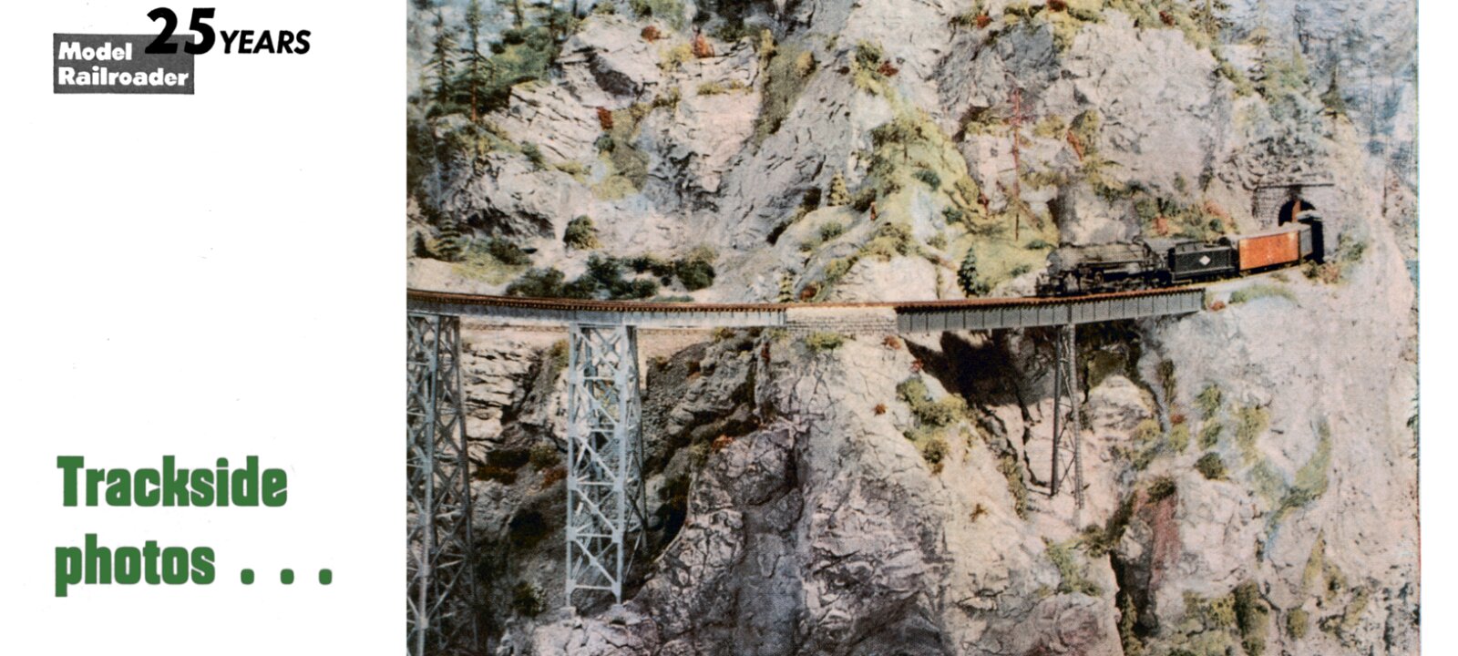 "Trackside Photo" in COLOR ! Caption: Model scenery that dwarfs the railroad it surrounds is most authentic because that is just what full-size scenery does to…