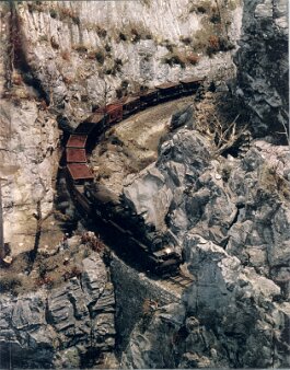 merged page 1 and 2 photos; photo caption: Gorre & Daphetid no. 35, an 0-6-6-0 modified from a Pacific Fast Mail imported brass 2-6-6-2, holds back an ore turn…