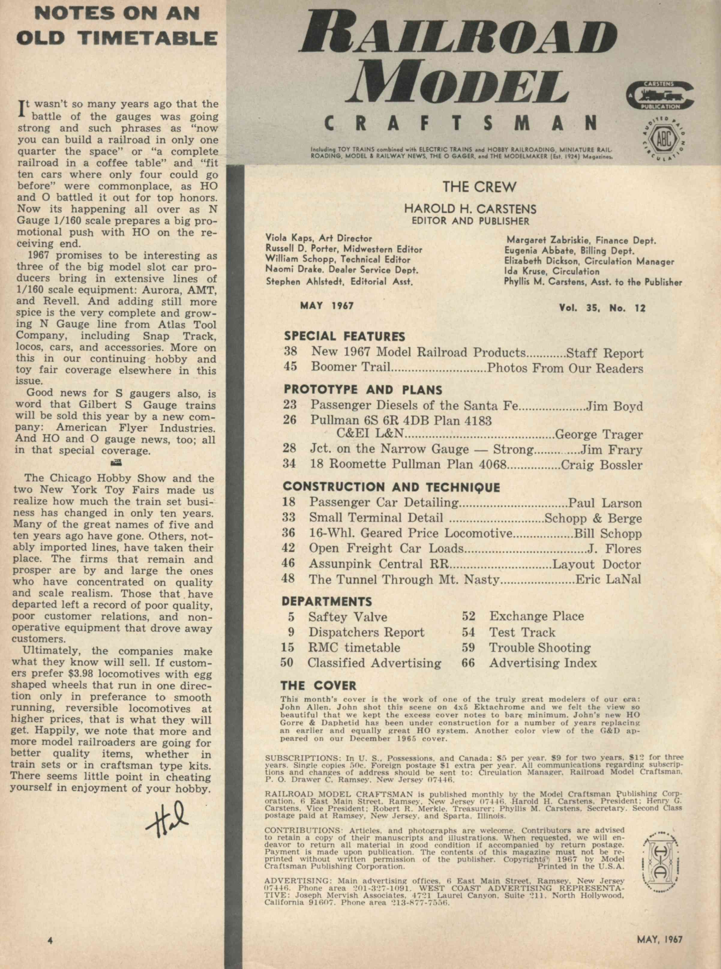 table of contents with description of cover, May 1967 Railroad Model Craftsman