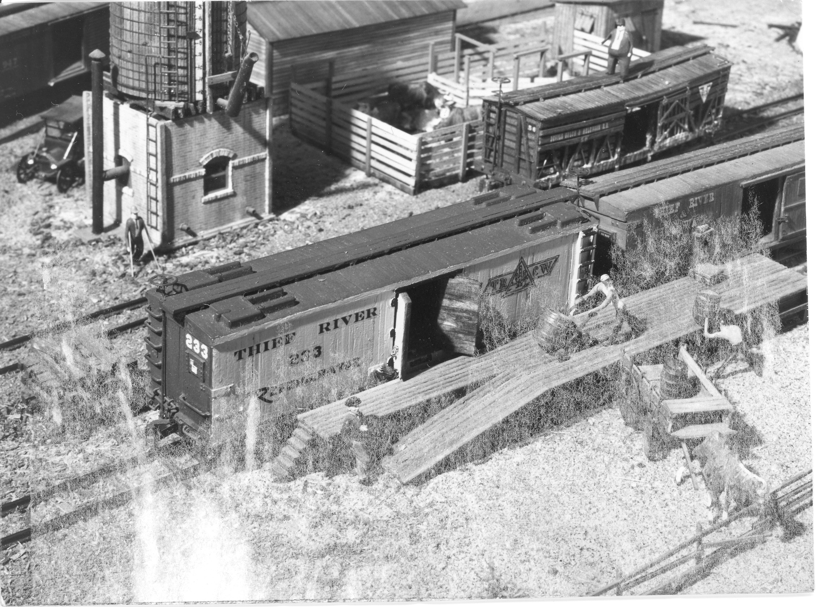 Diorama shot of several of Larry Grabert's Thief River and Chug Water HOn3 cars; the reefer appeared in the Apr. 1949 HO Monthly (posted on this site)