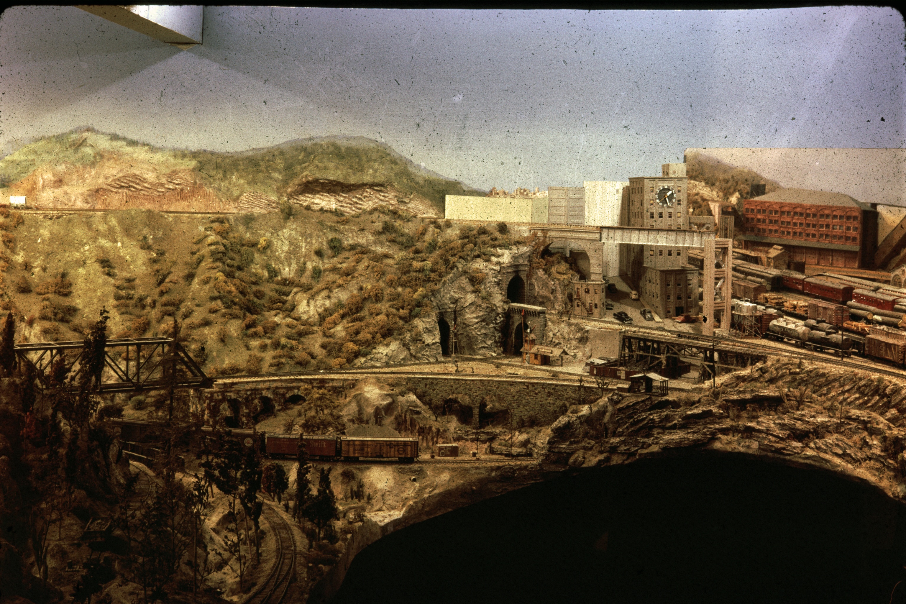 The clock and Cross Jct. with station and coal trestle. Note reflection of freight house at right, soon to be blocked by Depot and G&D headquarters building.