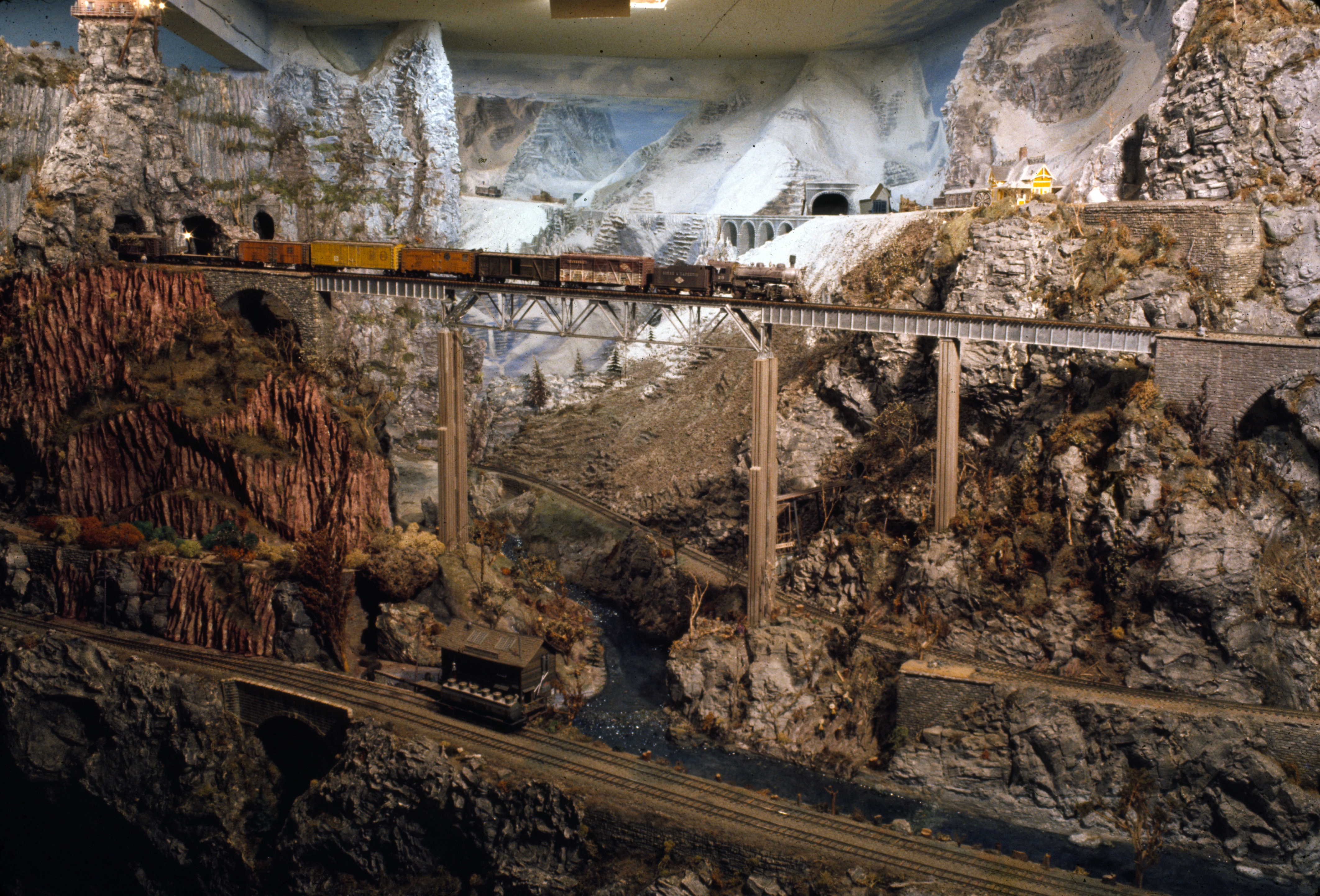 The high bridge over Helengon Gap with Cold Shoulder behind. Eagles Nest just visible at the top. The access basket is at track level. See reflection of stock pen and rotary plow in mirror, but not station.