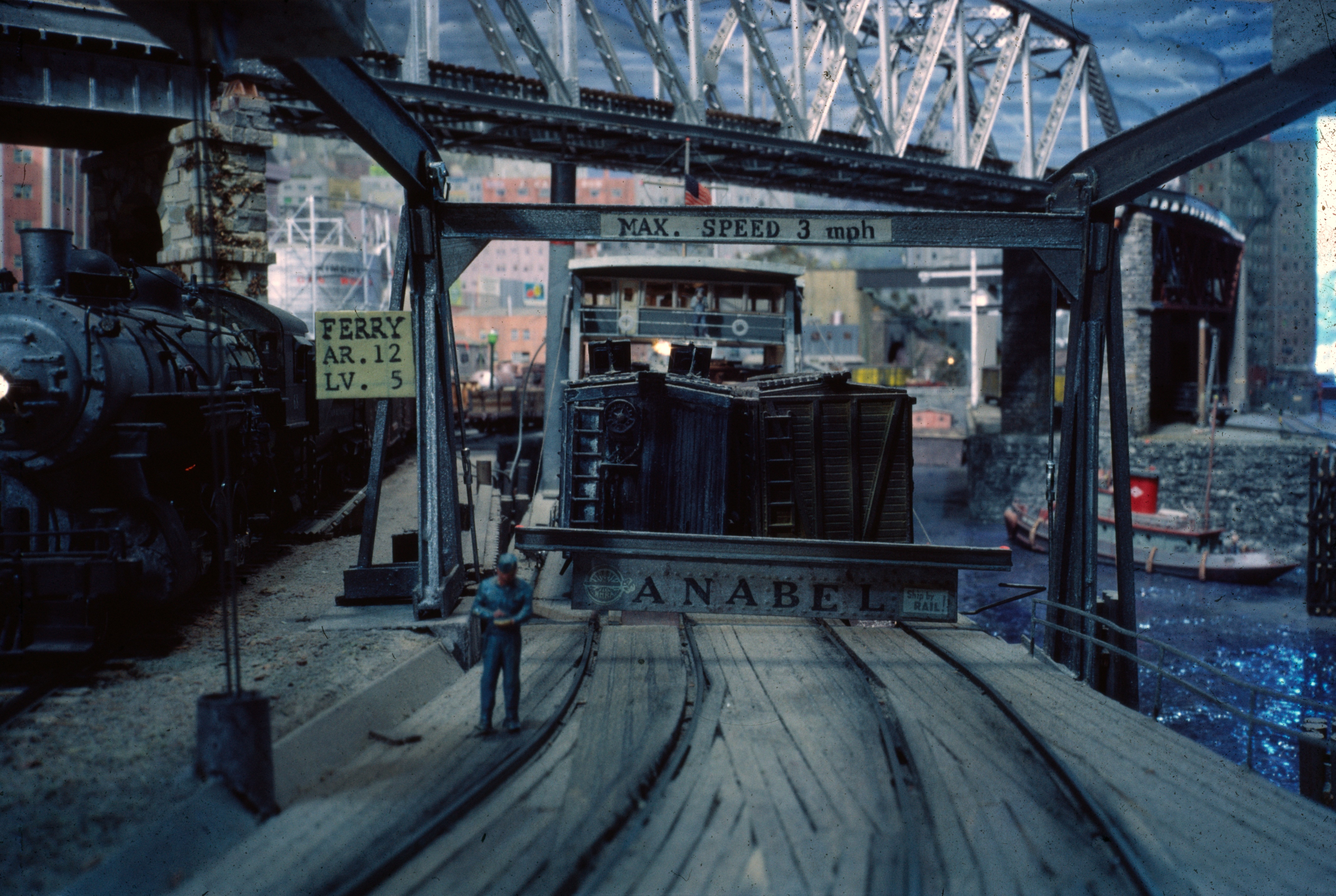 The Anabel car ferry, either arriving at or sailing from the float bridge.