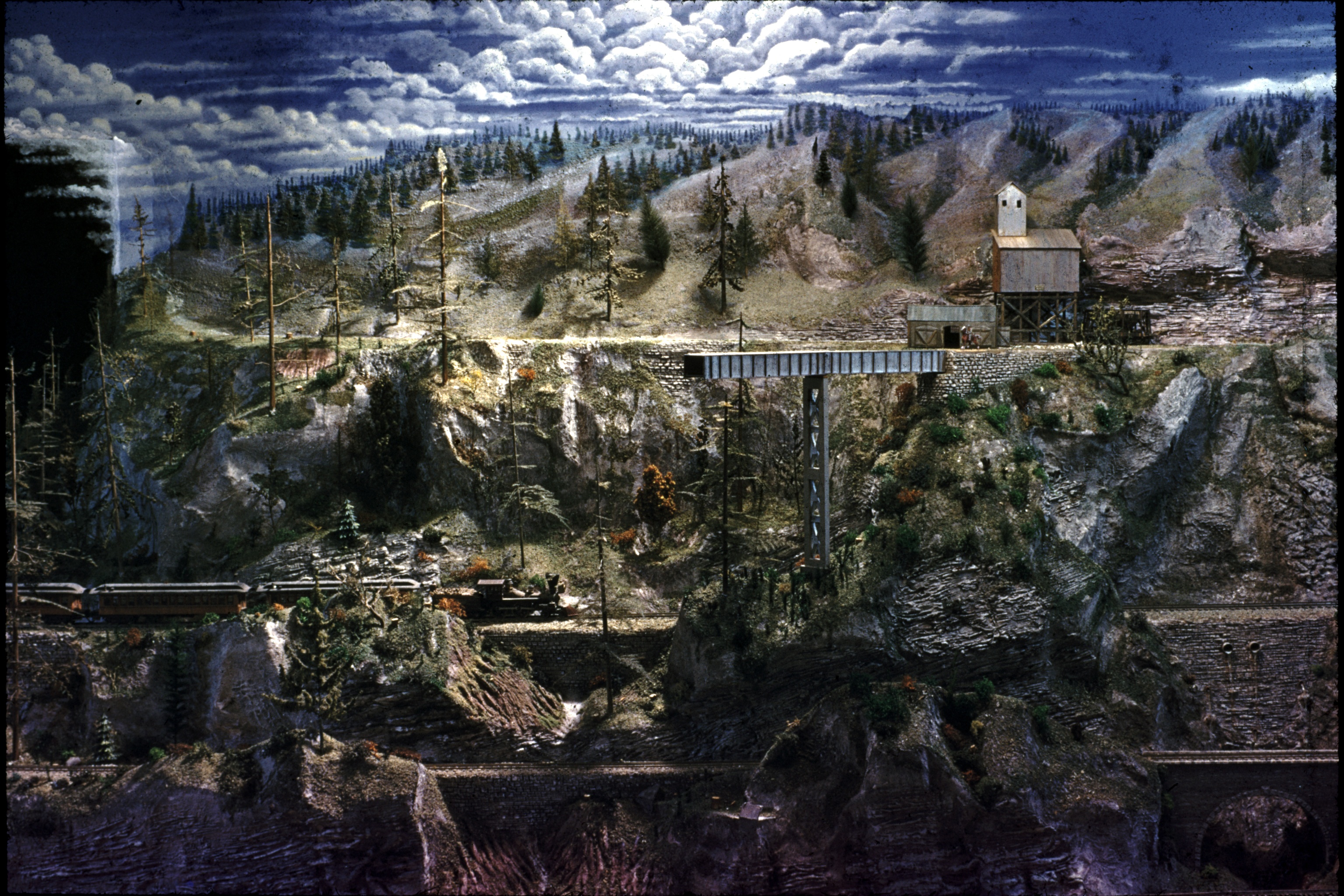 Ancient 4-4-0 #8 with wooden coaches in tow passes below the Butler Mine while a lone horseman views the unfinished high girder bridge under construction.