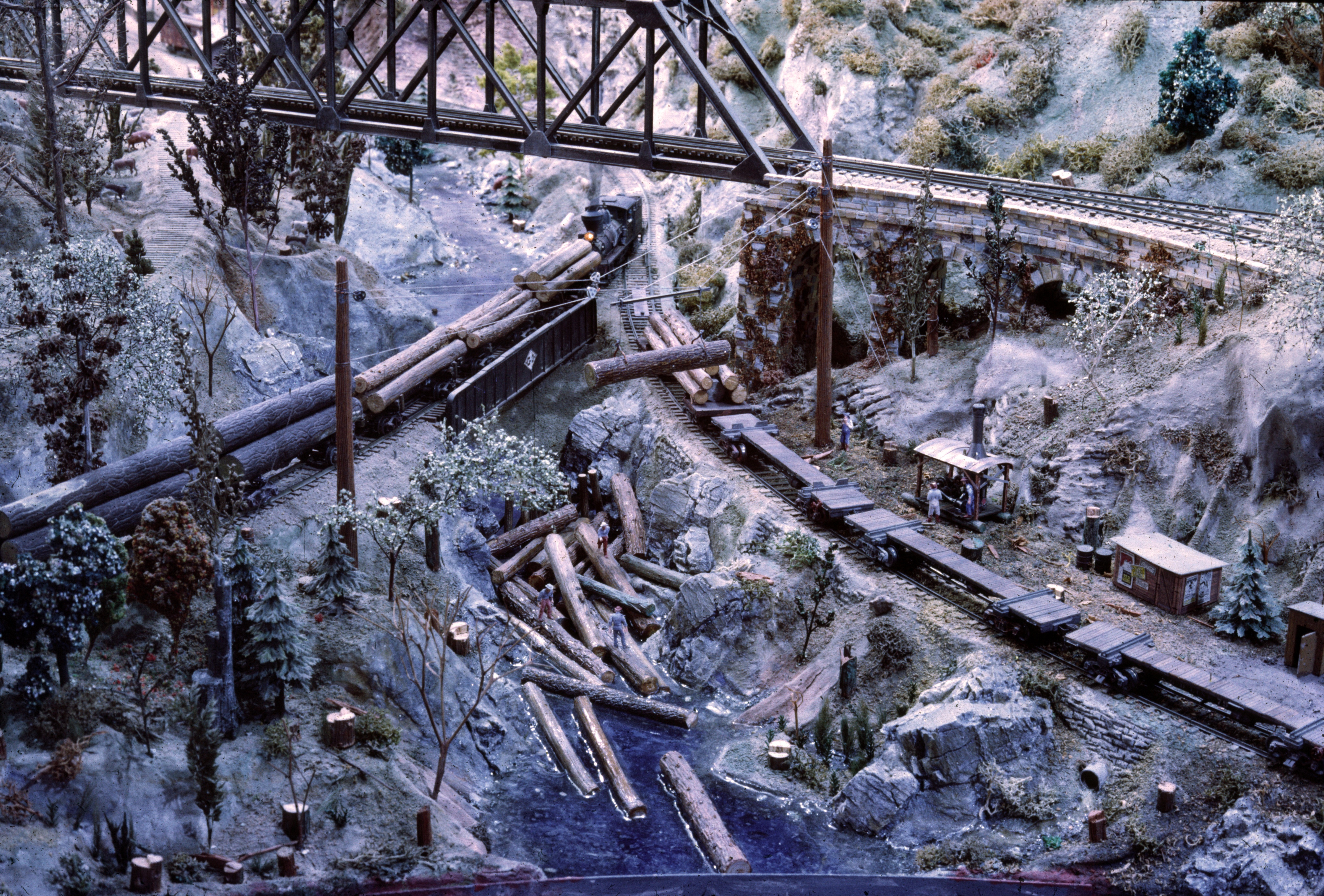 Logs that were floated downstream and formed a jam are being unloaded by steam donkey out of Sowbelly Creek. A similar scene was on the cover of the June. 1970 Railroad Model Craftsman magazine.