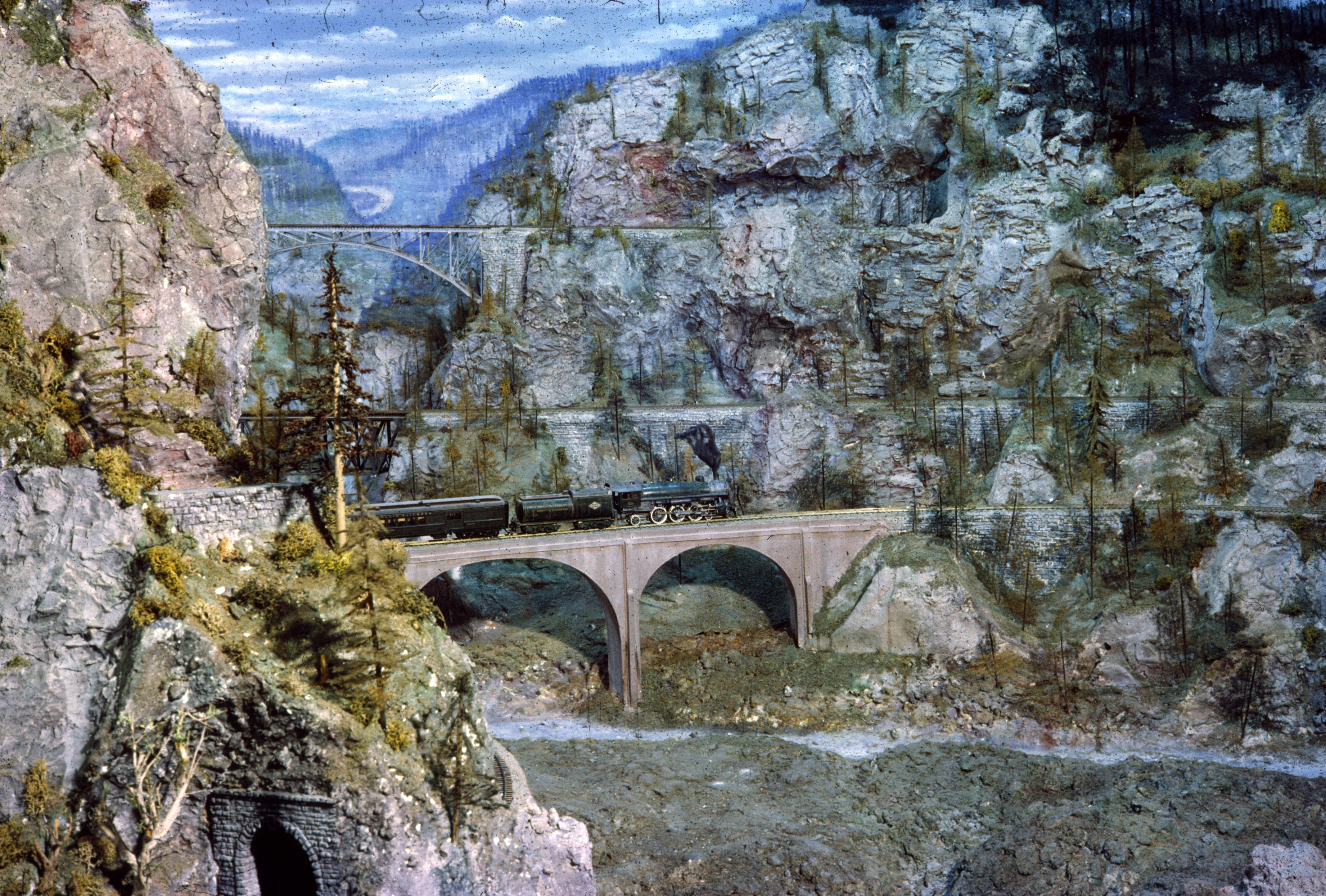 September of 1964 finds 4-6-2 #50 with a local passenger train in tow crossing the concrete viaduct over Squawbottom Creek. The middle track is a stiff 3 1/2% grade while the top track leads to the town of Akin.