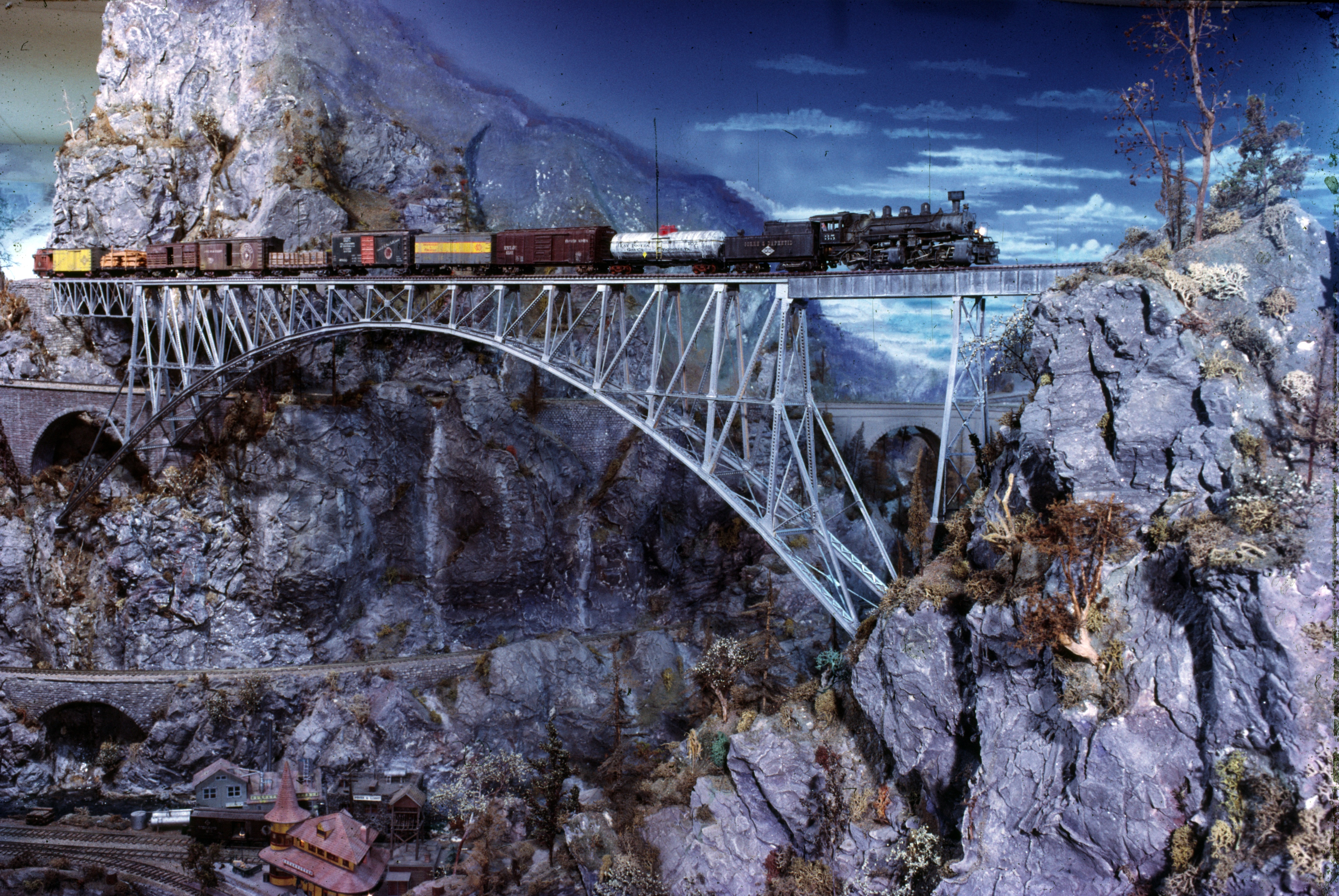 Having left Cold Shoulder, 0-6-6-0 #35 trundles across the Scalp Mountain Arch spanning Squawbottom Creek. Squawbottom Depot and the surrounding buildings can be seen at the lower left.