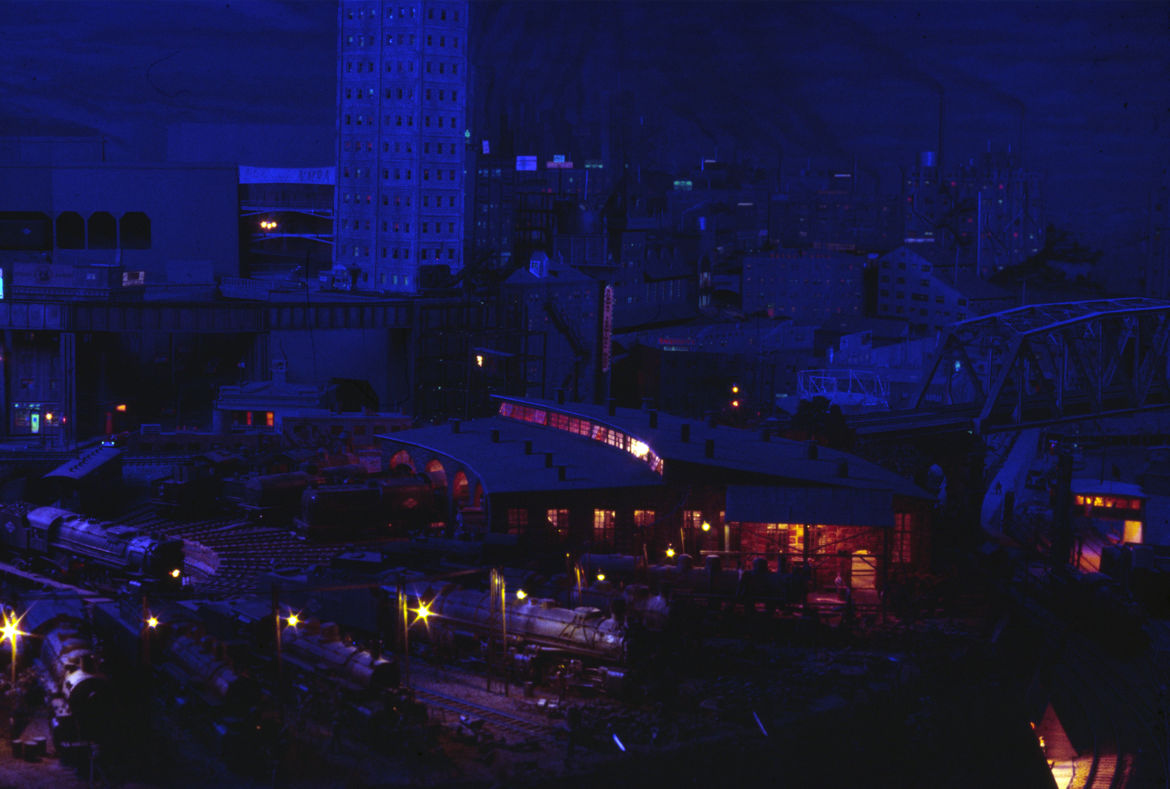 The night crew is busy at the Great Divide roundhouse and shops. 9-71