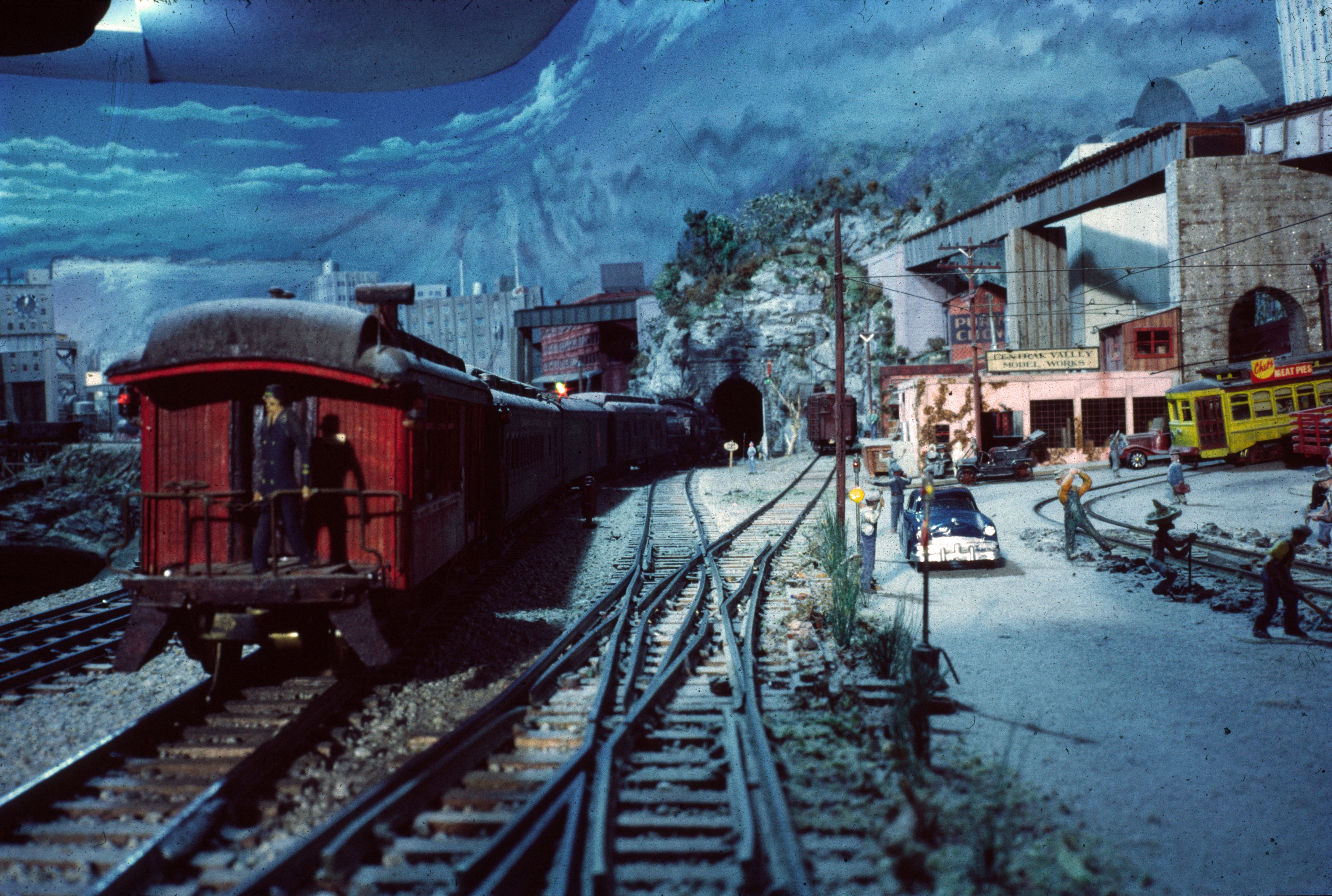 Trains leaving Great Divide back out of the yard then turn right into the tunnel between Great Divide and West Divide. The track gang is busy aligning the tracks of the Cooper Electric Railway (R). 7-68