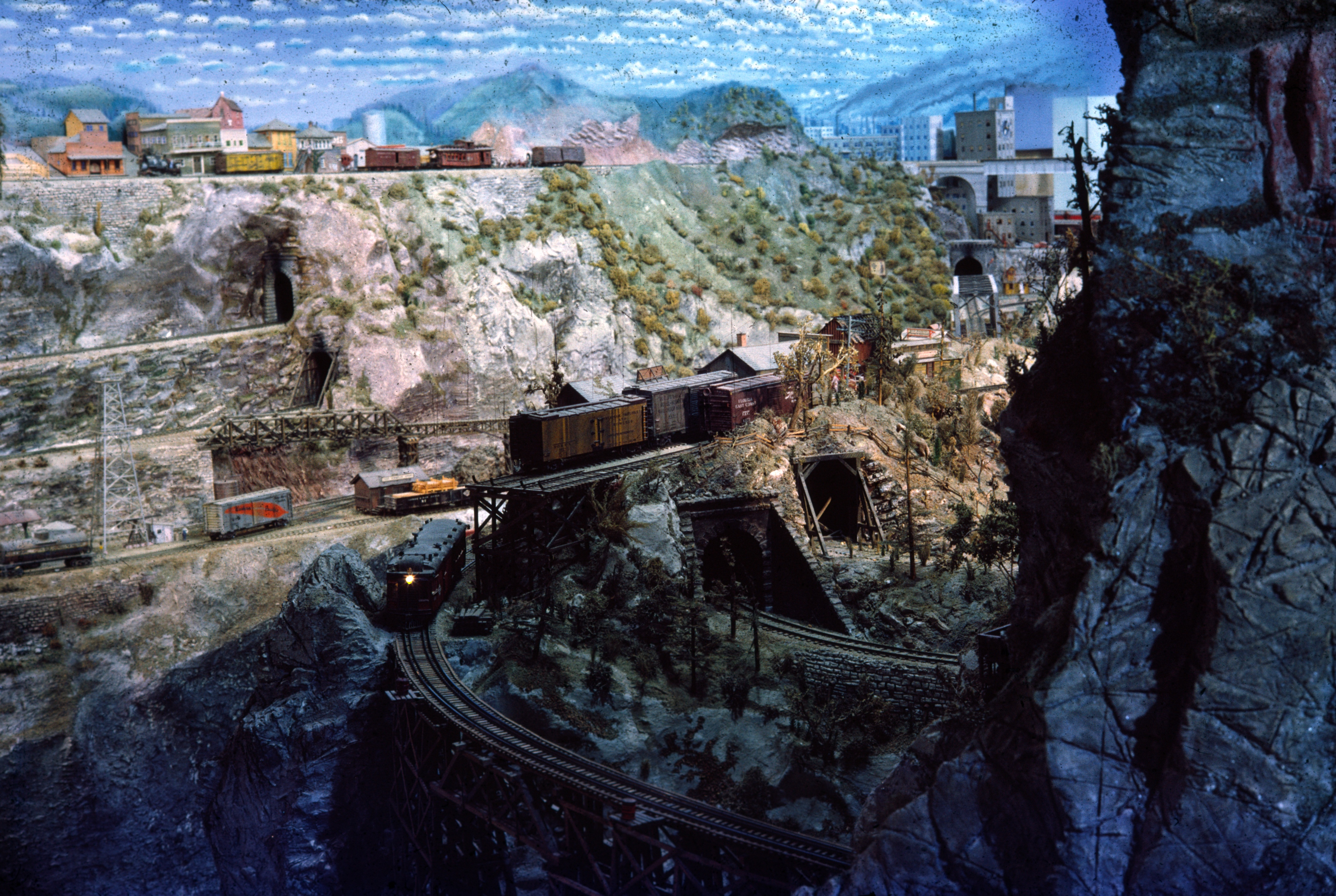 Devil’s Post Pile with gas electric #60 heading east over Ryan Trestle. Above and right of #60 is the stub end of the Daphetid branch. Angel’s Camp at the top left. 9-64
