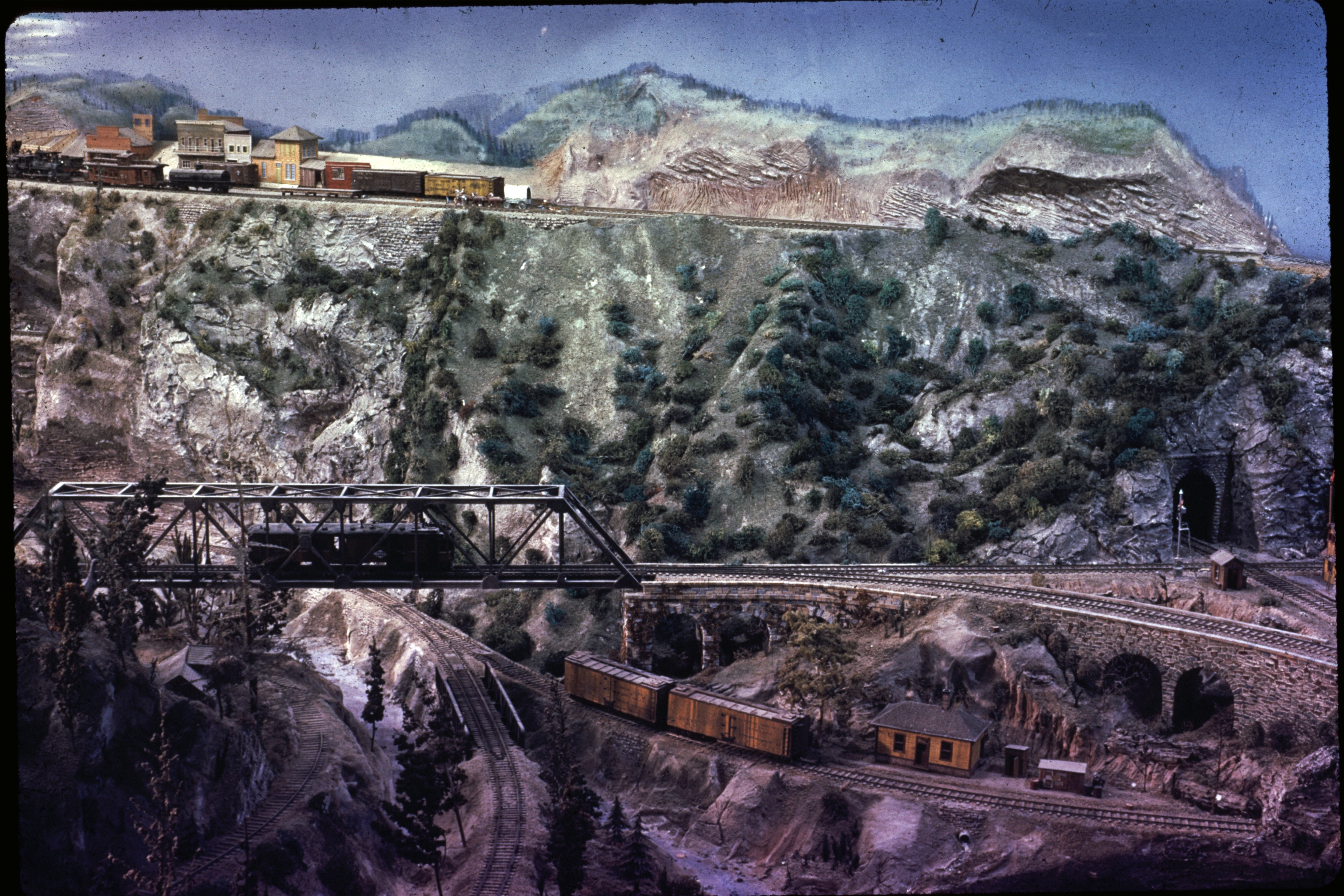 Gas electric #60 again as it crosses Squawbottom Creek near Cross Junction, which can be seen at the right. Angel’s Camp is at the top of the picture. 6-59