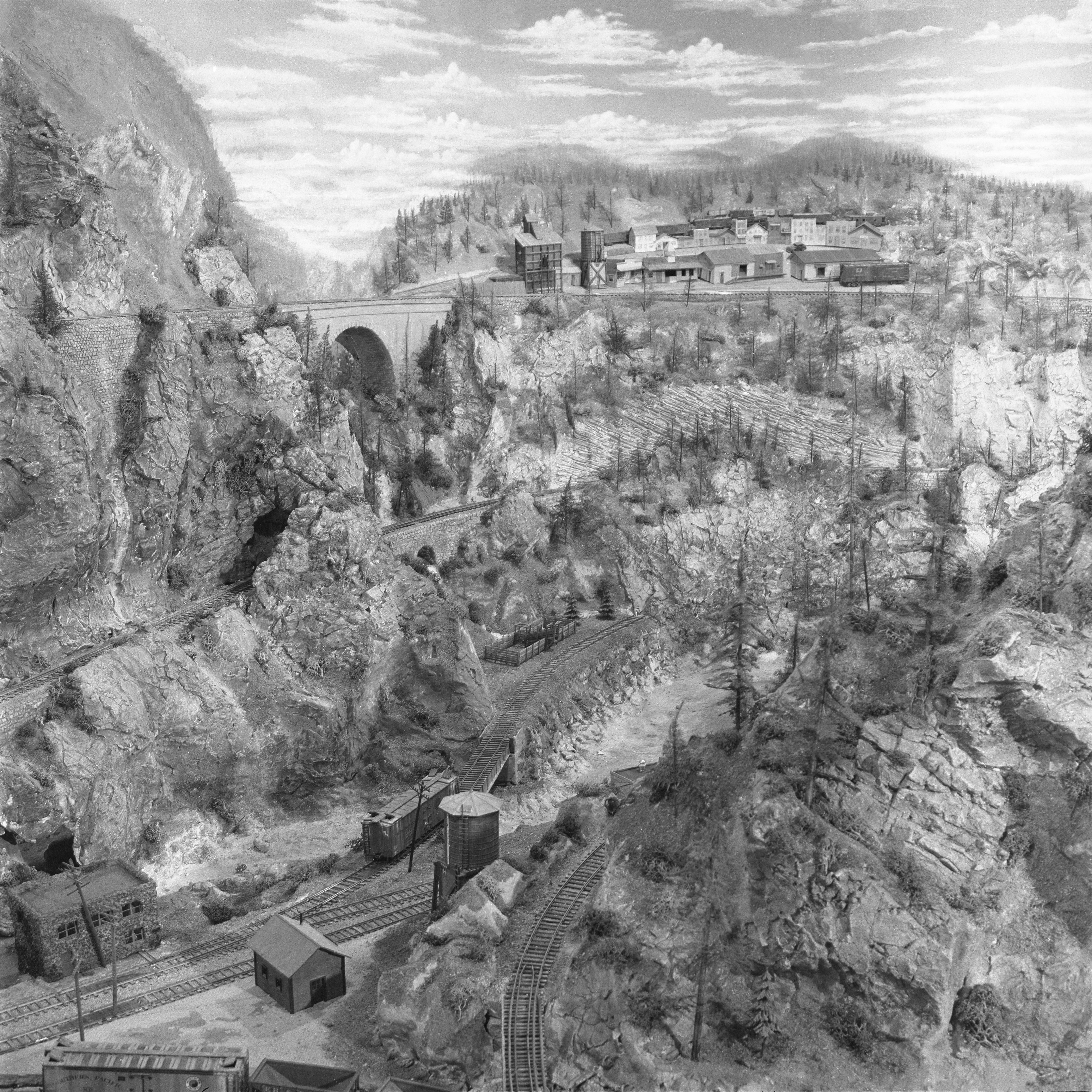 Squawbottom and Akin; note the switch machines are concealed by buildings. Also of interest is the forced-perspective used in Akin, including a distant railroad yard.