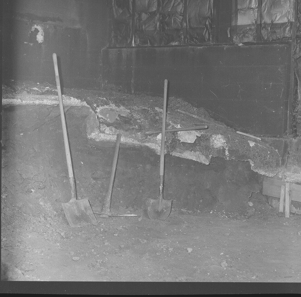 This worked well as the dirt was soft fill dirt. BUT when we came to the back corner where John had poured cement over the raised mound, it was the original hillside clay and chalkrock! A hard swing of the pick would remove only a SMALL chunk! H ere we are looking at the back corner behind Devil's Gulch where the big mirror was. Scalp is gone, and we have dug to about the bottome of Devil's Gulch.